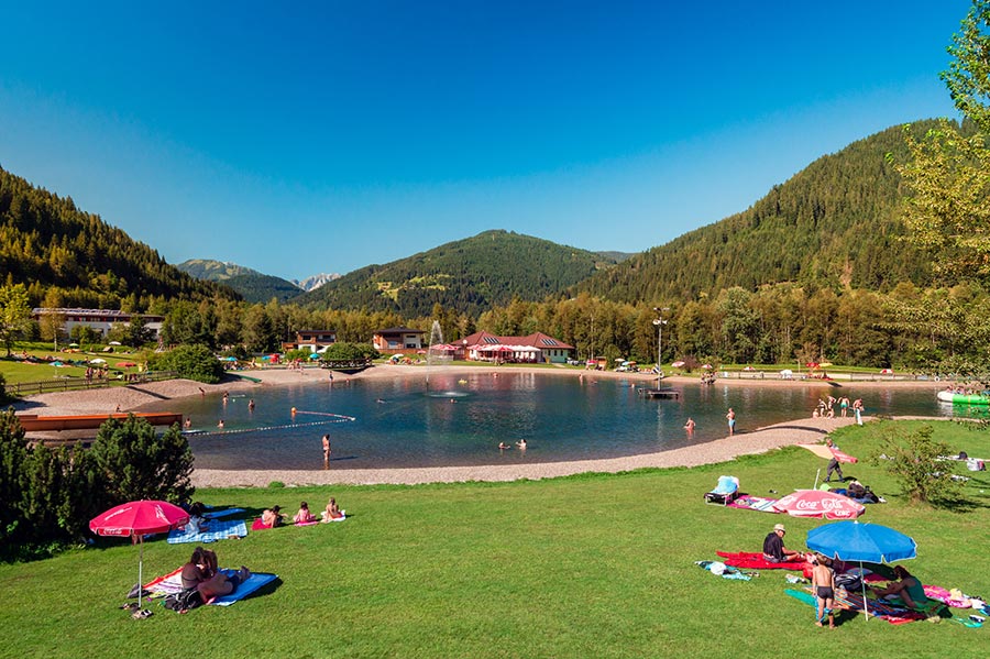 Der Erlebnisbadesee in Eben im Pongau mit großer Wasserrutsche, Kinderbecken, Spielplatz und Restaurant.